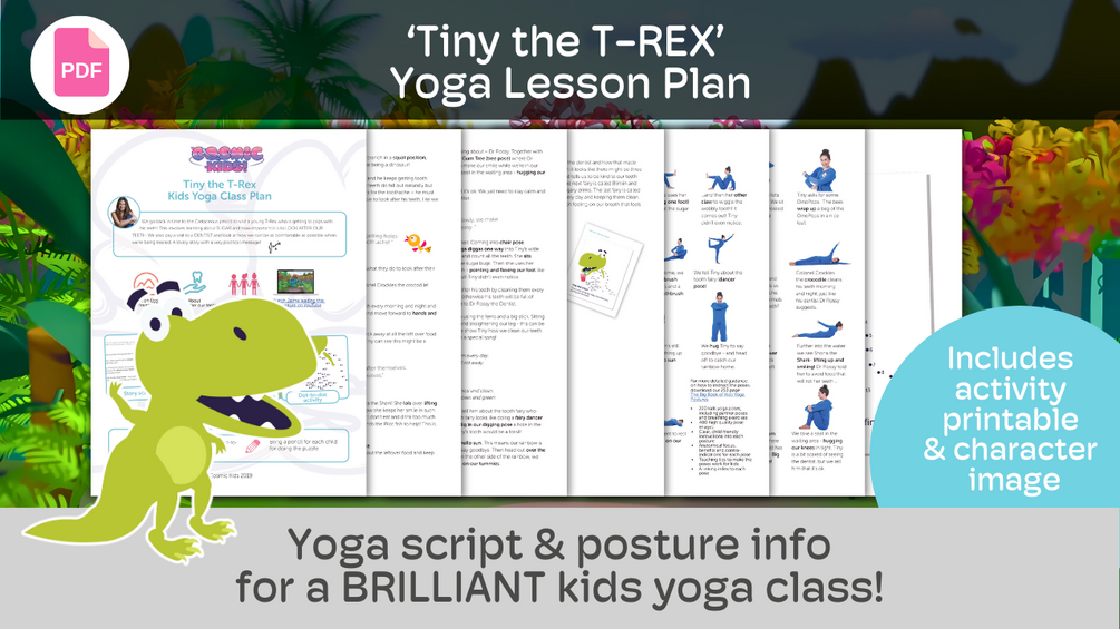 A 10 page PDF downloadable kids yoga class plan for the Cosmic Kids Yoga story – Tiny the T-Rex!