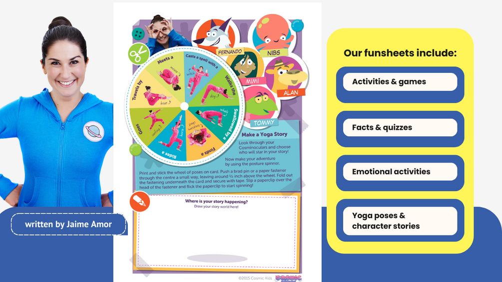 We made these fun sheets a few years ago as an offline companion to the yoga adventures we make. There are 12 x 2 page funsheets - each for a different character from a yoga adventure (and one for Jaime).