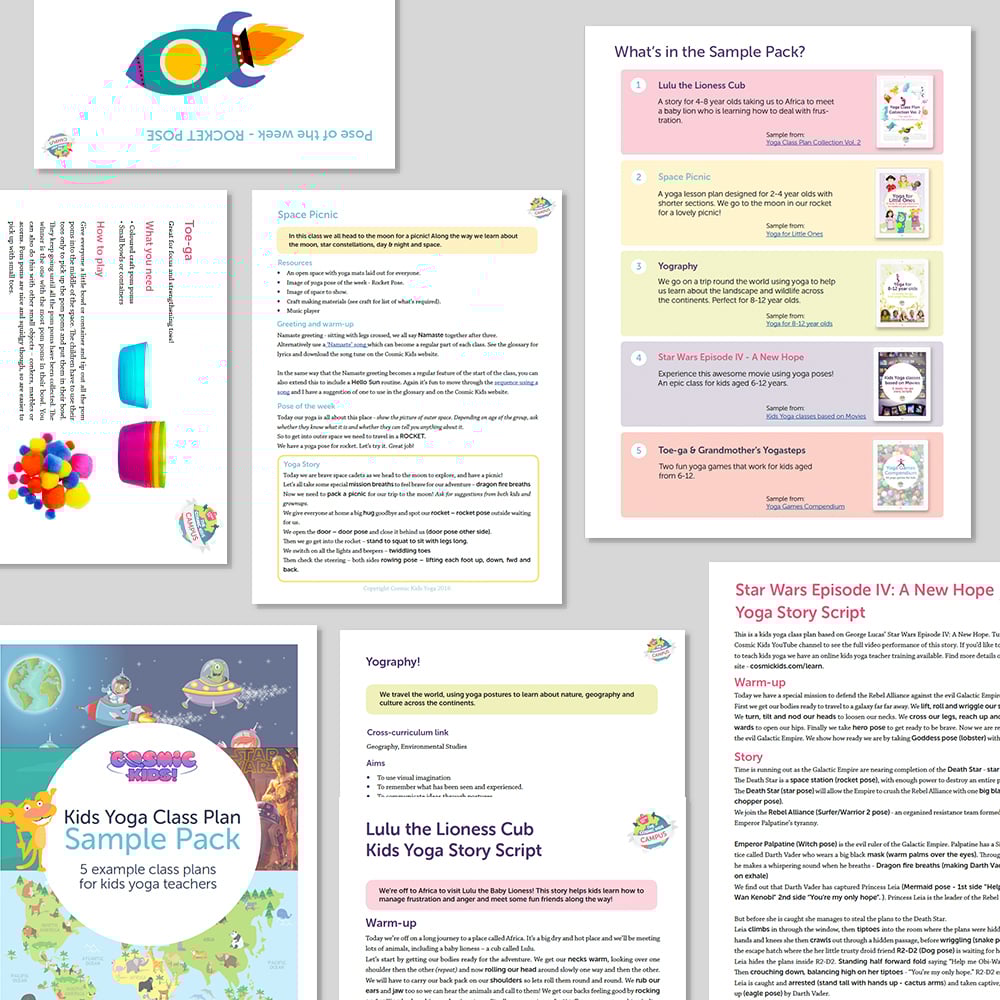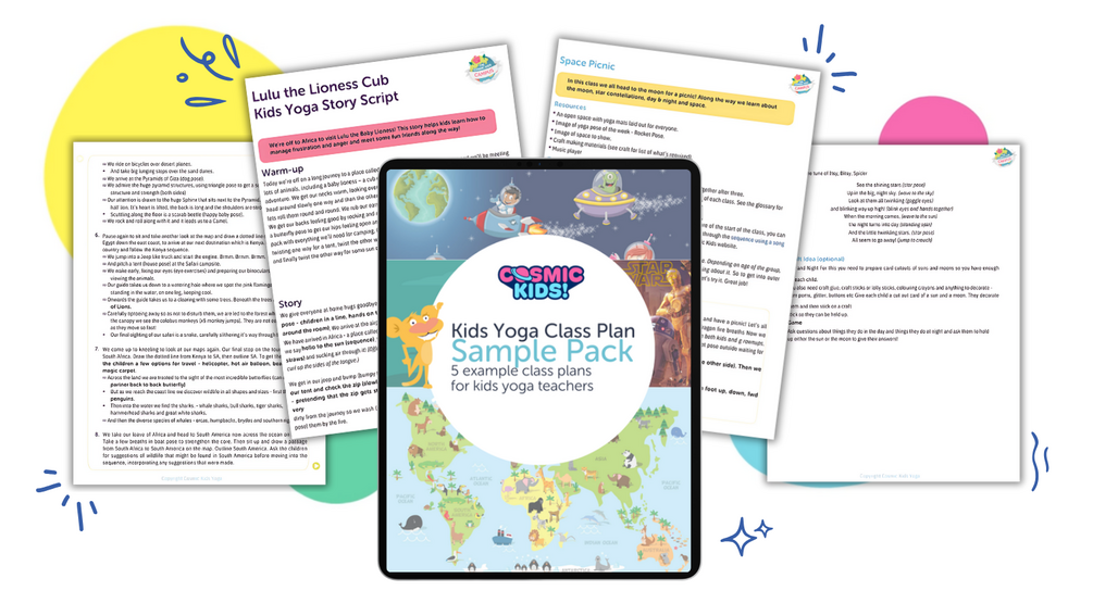 Cosmic Kids makes a wide range of classplans and games for kids yoga teachers. The purpose of this PDF is to show you what they are like – and to give you a taster of using them before committing to one of our bundles.