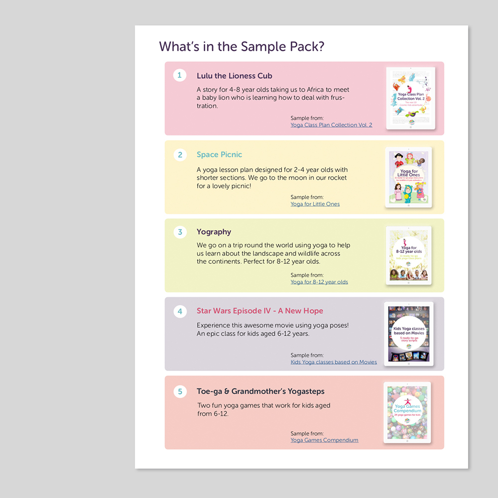 A free 25 page PDF sample pack of four kids yoga class plans and two games – to suit a variety of ages – to show you what you get when you buy Jaime’s class plans.