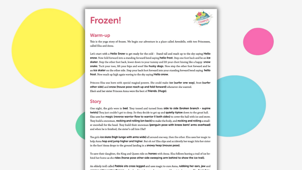 They are designed to be used by kids yoga teachers who have experience teaching yoga to children. If you are keen to learn we have a free crash course as well as a full certification training. Both of these are online and you can find out more at www.cosmickids.com/learn.