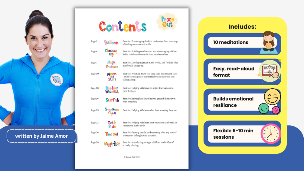 Included in this 34 page PDF download are the following meditation scripts taken from the Cosmic Kids meditation series, Peace Out: