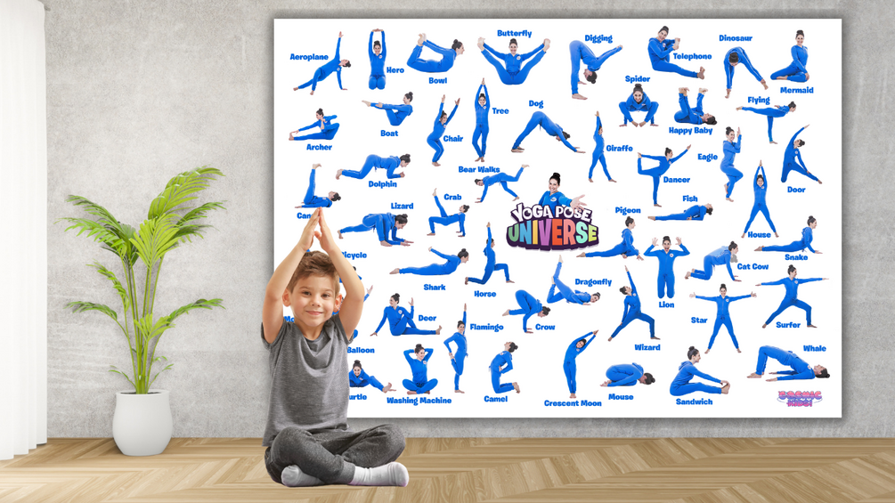 A hi-res poster of Jaime in 50 yoga poses with corresponding pose names. This supports our series about yoga poses, Yoga Pose Universe. Intended for the classroom, bedroom or playroom wall. Or the fridge door!